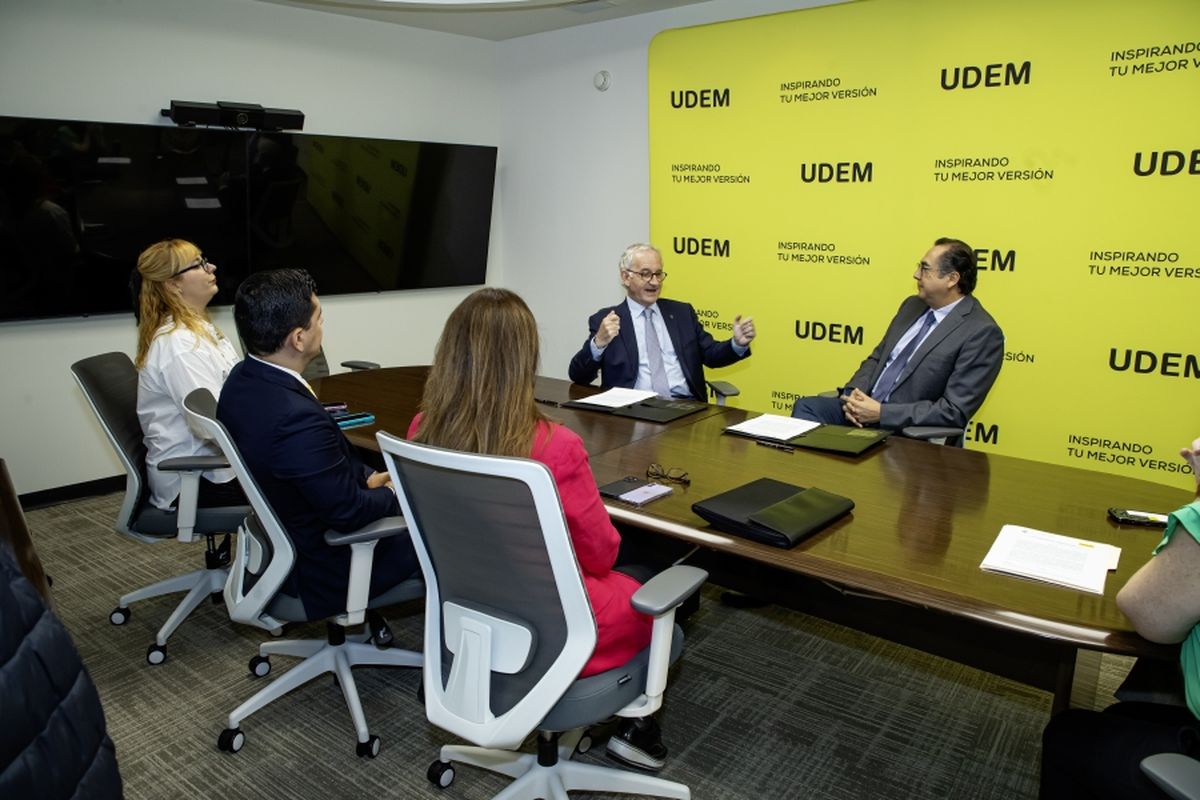 Presidieron la reunión Carlos Basurto Meza, vicerrector Académico de la UDEM, y Juan Francisco Corona Ramón, rector honorario del CEU. Estuvieron también Isabella Navarro Grueter, vicerrectora de Formación Integral; Alejandra Yáñez Vega, directora de Internacionalización; Karina Hernández, gerente de Alianzas Estratégicas; Juan José Martínez, decano de la Escuela de Negocios; y Emma Catalina Garza, directora del Departamento de Administración.
