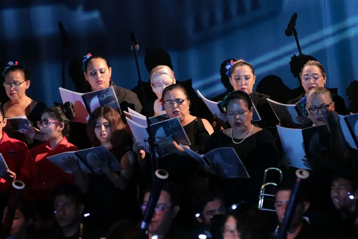 La espiritualidad de los cantos sagrados mezclados con ritmos de marchas belicistas, ejecutados por alrededor de 200 menores en escena, hizo vibrar la sala del Teatro UDEM con la presentación de la Orquesta y Coro Esperanza Azteca, acompañados por el Coro de la Arquidiócesis de Monterrey.