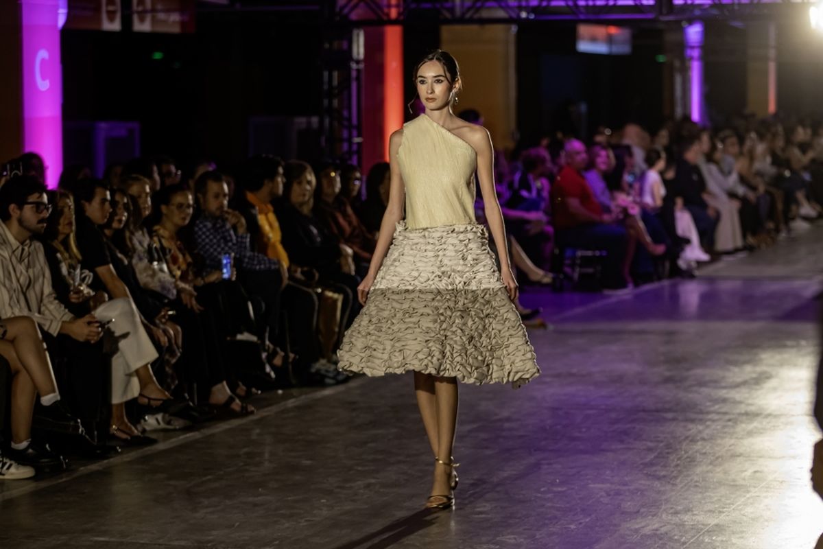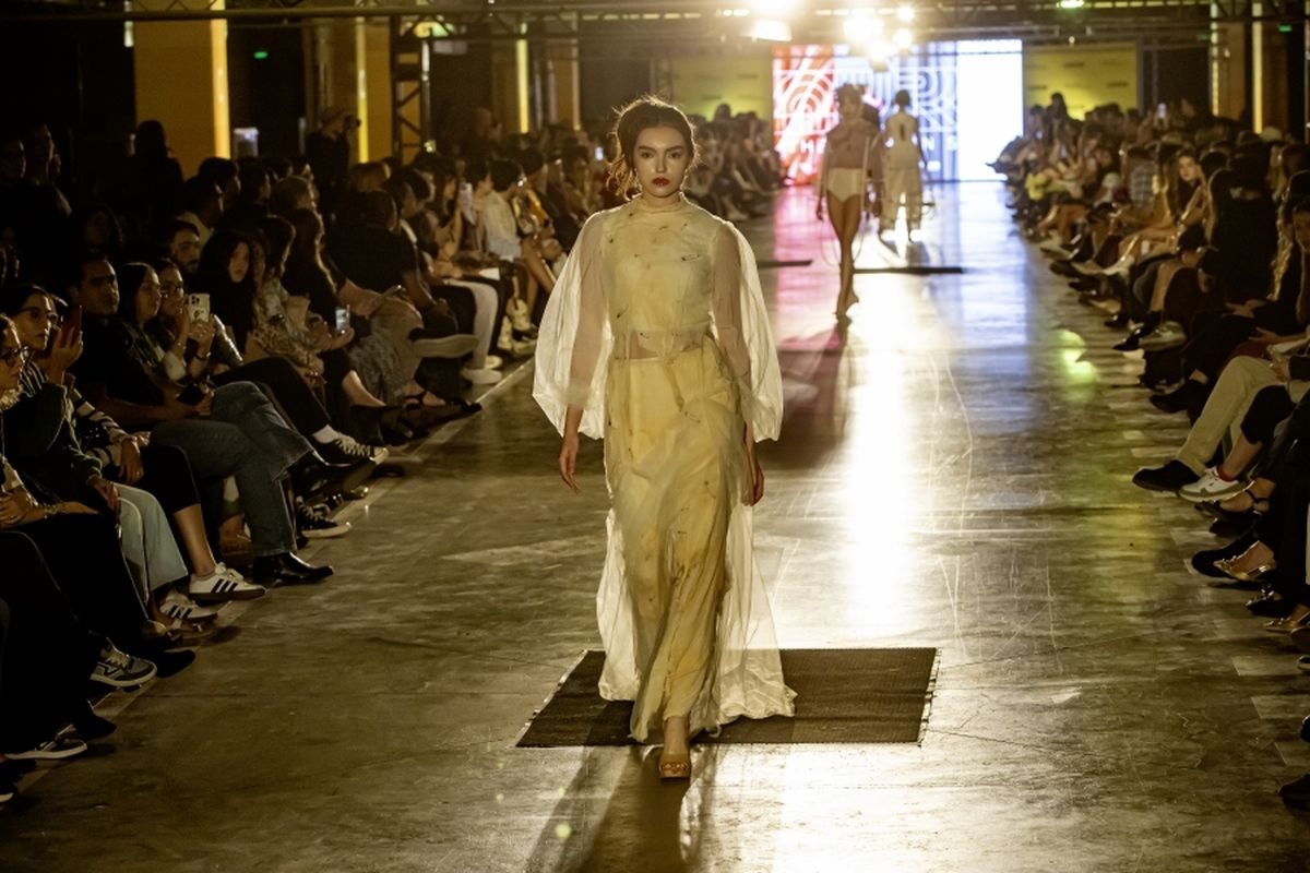 Tejidos con mucha estructura, piezas innovadoras elaboradas con biotextiles, incluyendo uno que simulaba la piel humana y otro a base de cenizas, junto a diseños que surgieron de la experimentación textil de fibras basadas en desechos orgánicos formaron parte de la pasarela Aura: The Fashion Show.