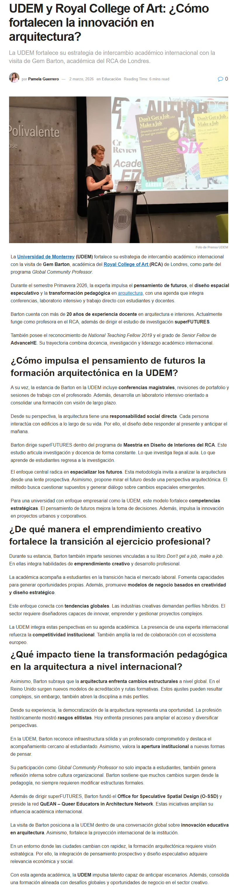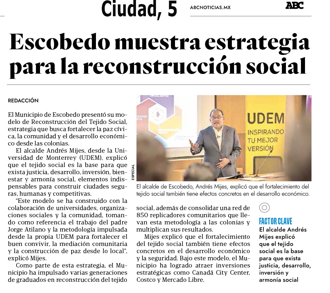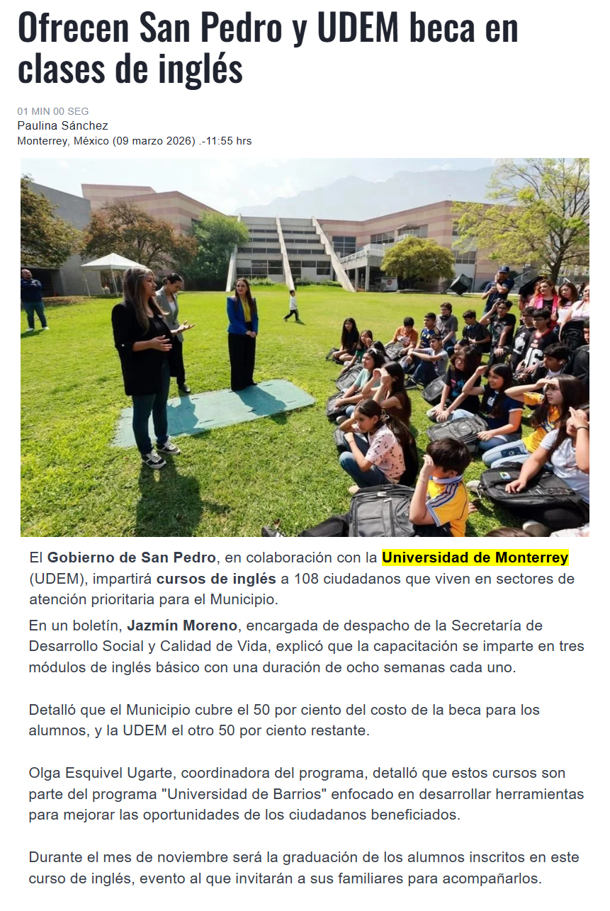 UDEM / Noticias institucionales / UDEM en la prensa Marzo 2026 Marzo2026 Ofrecen San Pedro y UDEM beca en clases de inglés El Norte10 de marzo Escobedo muestra estrategia para la reconstrucción social ABC Noticias10 de marzo Dan lección: brindan apoyo a primaria El Norte10 de marzo Alumnos de la UDEM impulsan ahorro energético industrial El Norte2 de marzo Estudiantes psicoanalizan moda y diseño El Norte2 de marzo ¿Cómo fortalece la UDEM su liderazgo en ingeniería junto a la NASA?: SEEC 2026 Líder Empresarial2 de marzo UDEM y Royal College of art ¿Cómo fortalecen la innovación en arquitectura? Líder Empresarial2 de marzo Estudiantes psicoanalizan moda y diseño El Norte2 de marzo Samuel Ramírez / La reforma de Sheinbaum El Norte1 de marzo