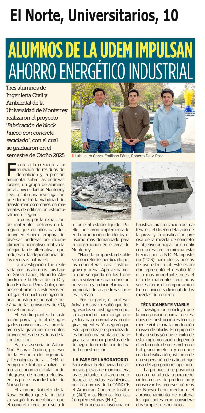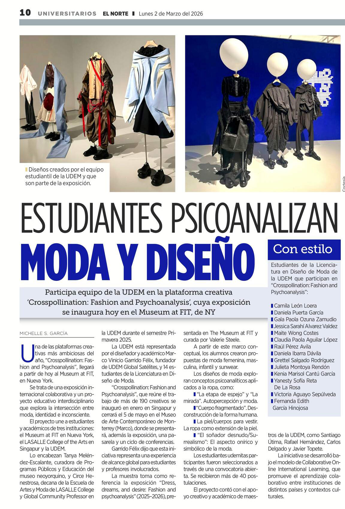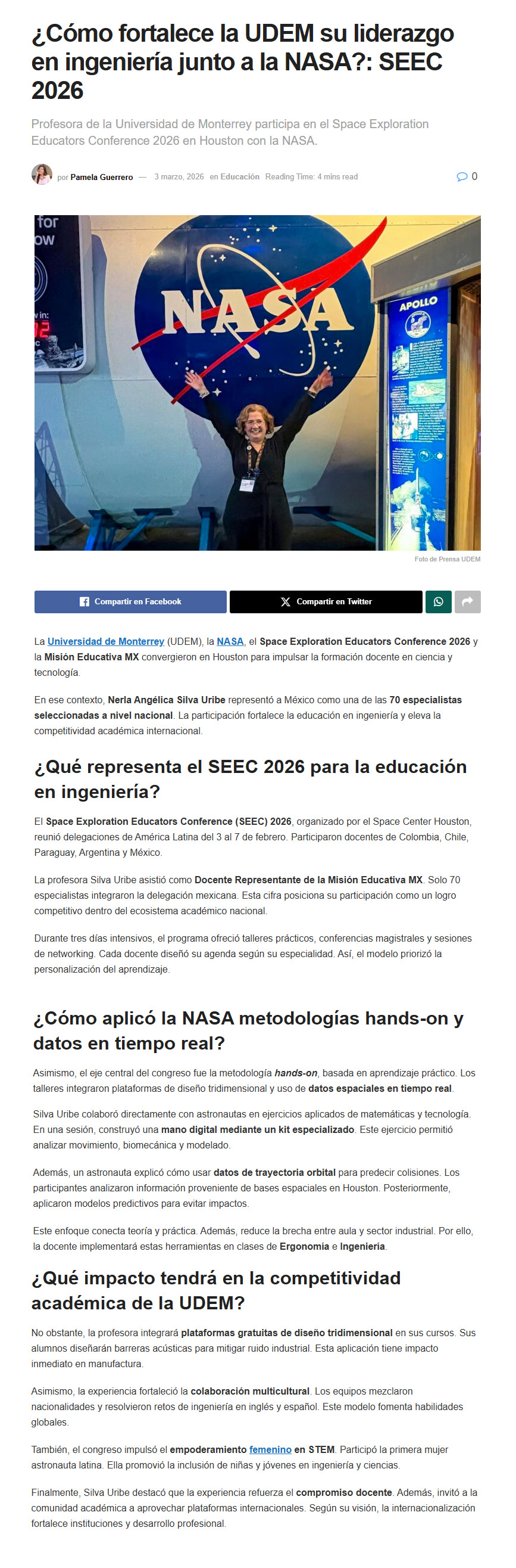 UDEM / Noticias institucionales / UDEM en la prensa Marzo 2026 Marzo2026 Ofrecen San Pedro y UDEM beca en clases de inglés El Norte10 de marzo Escobedo muestra estrategia para la reconstrucción social ABC Noticias10 de marzo Dan lección: brindan apoyo a primaria El Norte10 de marzo Alumnos de la UDEM impulsan ahorro energético industrial El Norte2 de marzo Estudiantes psicoanalizan moda y diseño El Norte2 de marzo ¿Cómo fortalece la UDEM su liderazgo en ingeniería junto a la NASA?: SEEC 2026 Líder Empresarial2 de marzo UDEM y Royal College of art ¿Cómo fortalecen la innovación en arquitectura? Líder Empresarial2 de marzo Estudiantes psicoanalizan moda y diseño El Norte2 de marzo Samuel Ramírez / La reforma de Sheinbaum El Norte1 de marzo