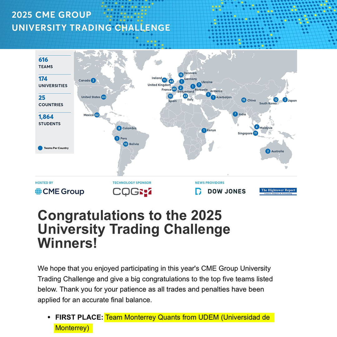 El desafío fue organizado por el CME Group, una de las bolsas de instrumentos financieros derivados más grandes del mundo. Los estudiantes de la Escuela de Negocios de la UDEM superaron a mil 864 estudiantes de 174 universidades, participantes de 25 países distintos, para conseguir la victoria.