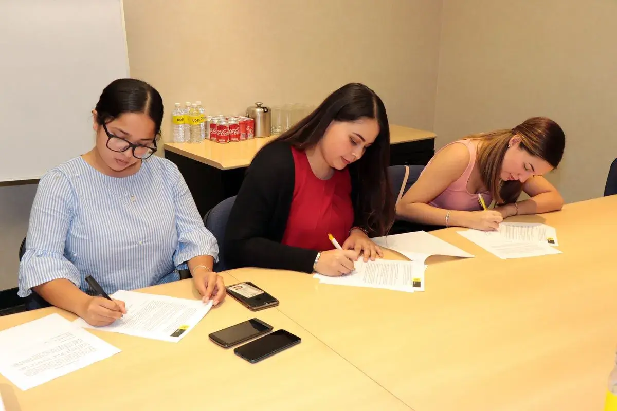 Las estudiantes firmaron sus convenios la tarde de este martes, en la Sala de la Dirección de Atracción Estudiantil, con la presencia de directivas de la UDEM y de la empresa fabricante de maquinaria para la construcción, equipos de minería y motores diésel.