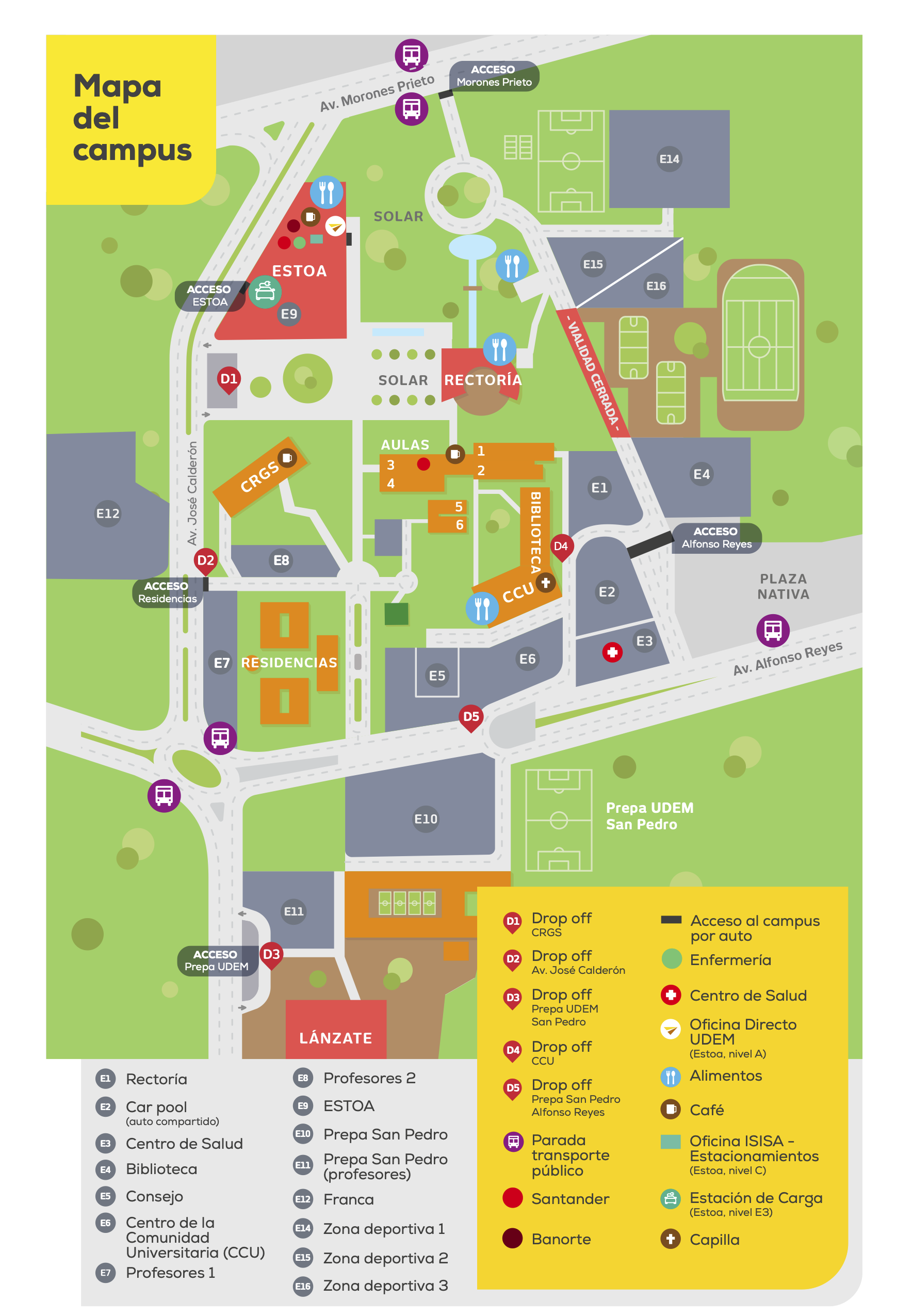 Puedes llegar al campus en automóvil, transporte público, o haciendo uso de los transportes escolares Directo UDEM y Circuito UDEM, que cuentan con varias rutas.