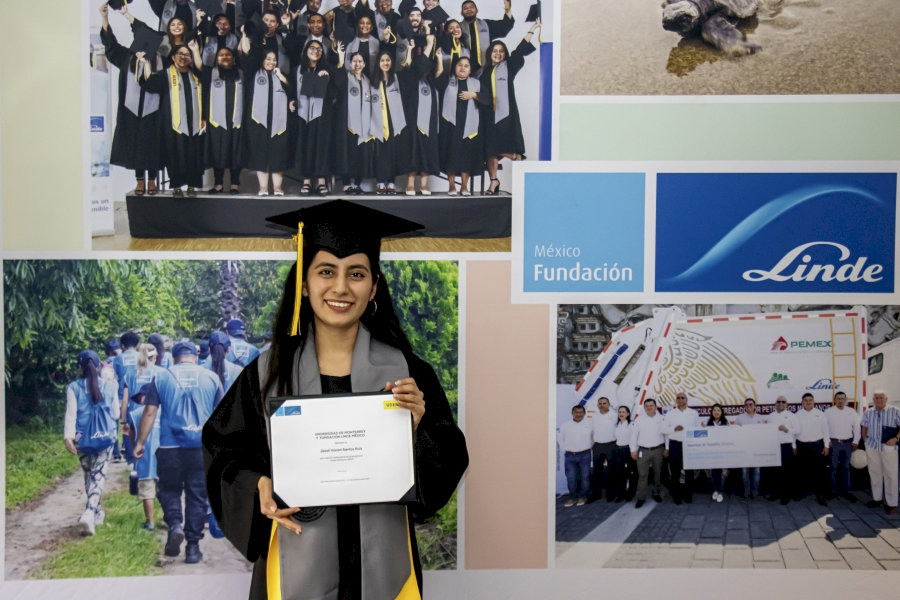 El acto tuvo lugar el pasado 17 de diciembre en la Sala Fundadores del campus de la Universidad de Monterrey, donde directivos universitarios, representantes de Linde LATAM Norte y familiares acompañaron a la egresada en este momento decisivo de su trayectoria académica y personal.