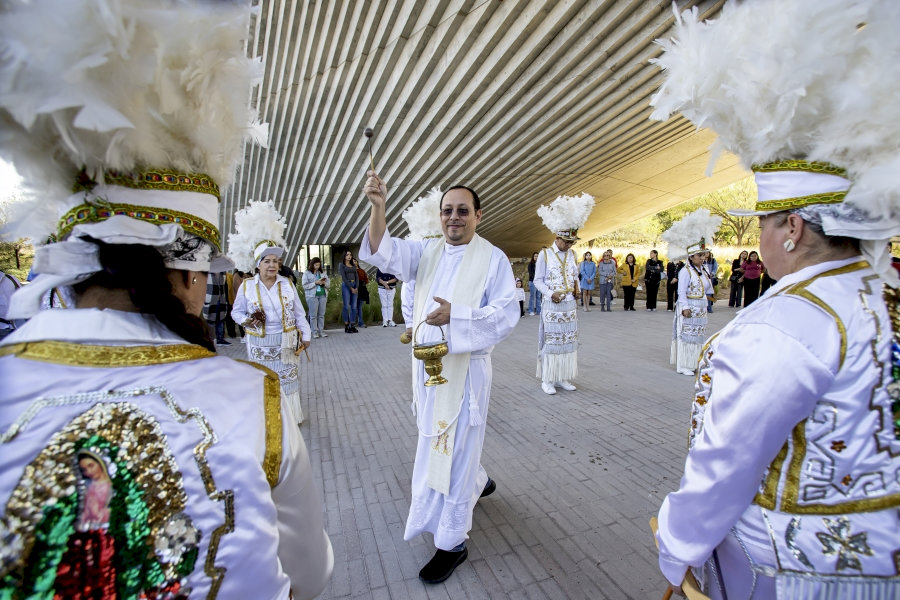 La ceremonia inició con la participación del grupo de matachines de la UDEM, quienes partieron desde la Vela del Centro Roberto Garza Sada de Arte, Arquitectura y Diseño para encabezar la peregrinación hacia el sombreado de aulas, donde se realizó la eucaristía presidida por fray Óscar Alejandro García.