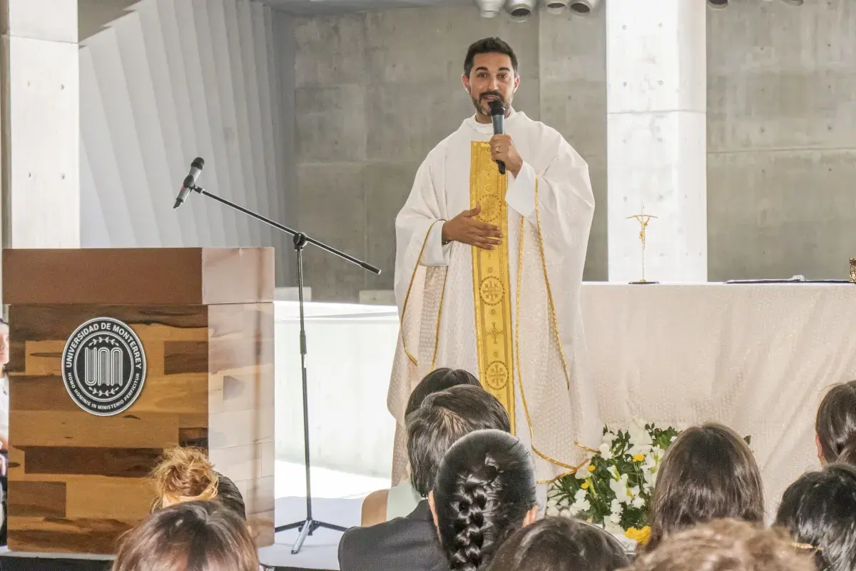 Alejandro Beltrán, capellán de la UDEM, invitó a docentes, estudiantes y colaboradores a construir una vida con cimientos tan firmes como los de este inmueble diseñado por Tadao Ando, ganador del Premio Pritzker.