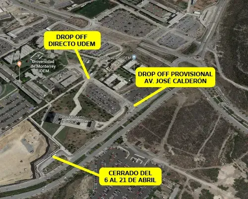 - Si eres usuario de Circuito UDEM, tu punto de ascenso y descenso será en el drop off provisional sobre la Av. José Calderón.