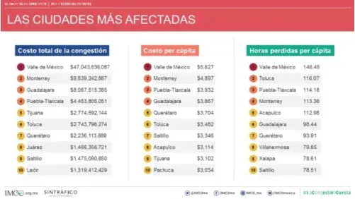 El pasado 10 de septiembre, el Instituto Mexicano para la Competitividad (IMCO) y SinTráfico publicaron por primera vez el impacto social y económico de la congestión vial en México. Fueron analizadas 32 ciudades del país, el tiempo perdido promedio equivale a 11 días de vacaciones al año.