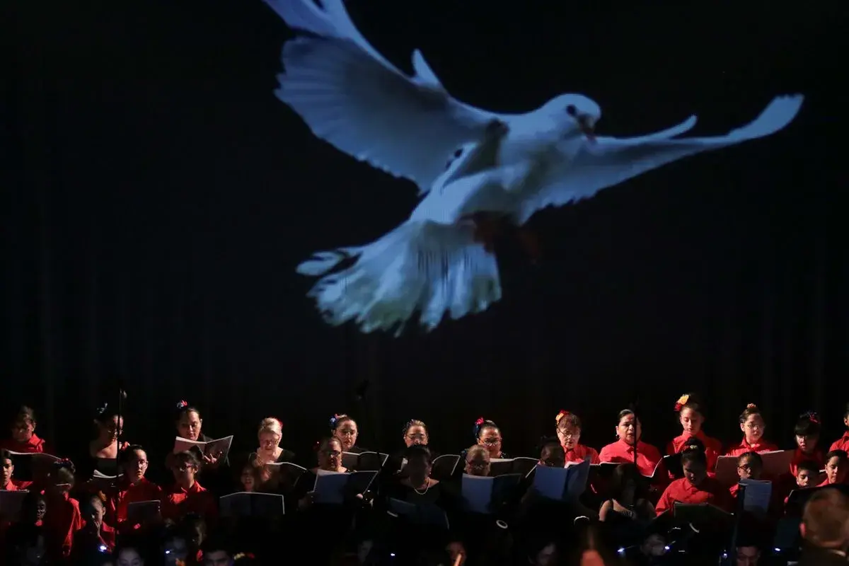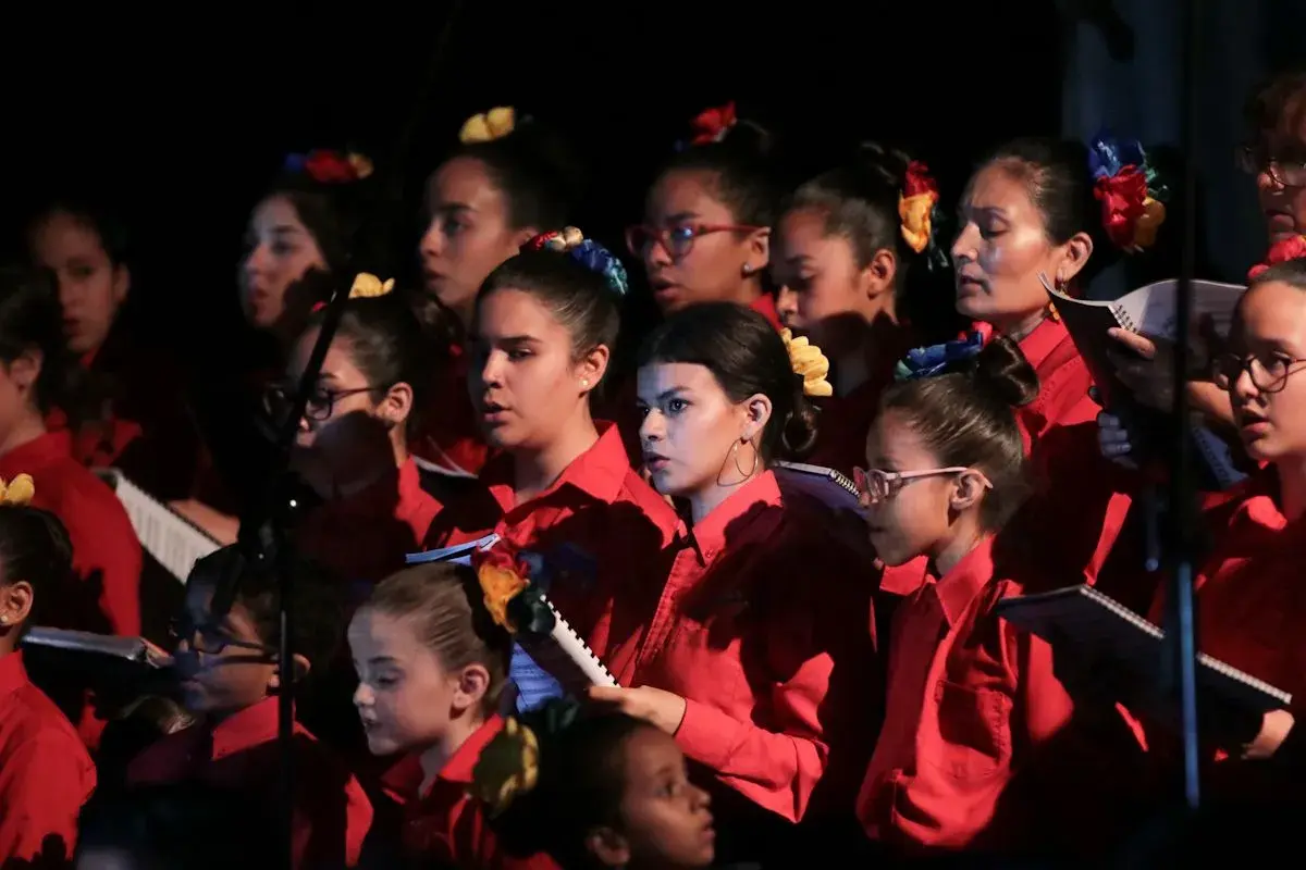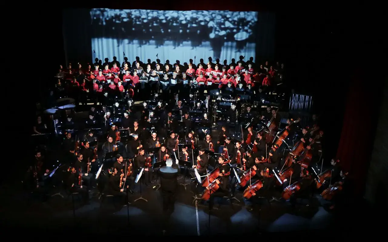 La espiritualidad de los cantos sagrados mezclados con ritmos de marchas belicistas, ejecutados por alrededor de 200 menores en escena, hizo vibrar la sala del Teatro UDEM con la presentación de la Orquesta y Coro Esperanza Azteca, acompañados por el Coro de la Arquidiócesis de Monterrey.