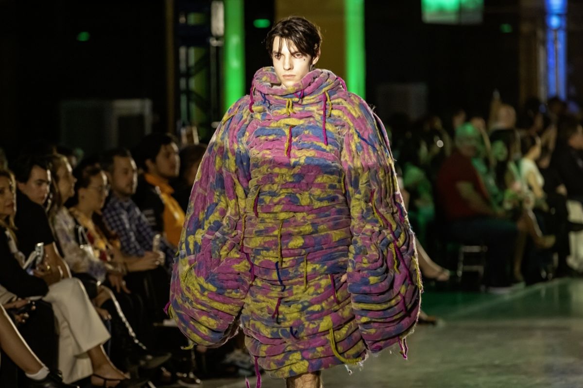 Tejidos con mucha estructura, piezas innovadoras elaboradas con biotextiles, incluyendo uno que simulaba la piel humana y otro a base de cenizas, junto a diseños que surgieron de la experimentación textil de fibras basadas en desechos orgánicos formaron parte de la pasarela Aura: The Fashion Show.