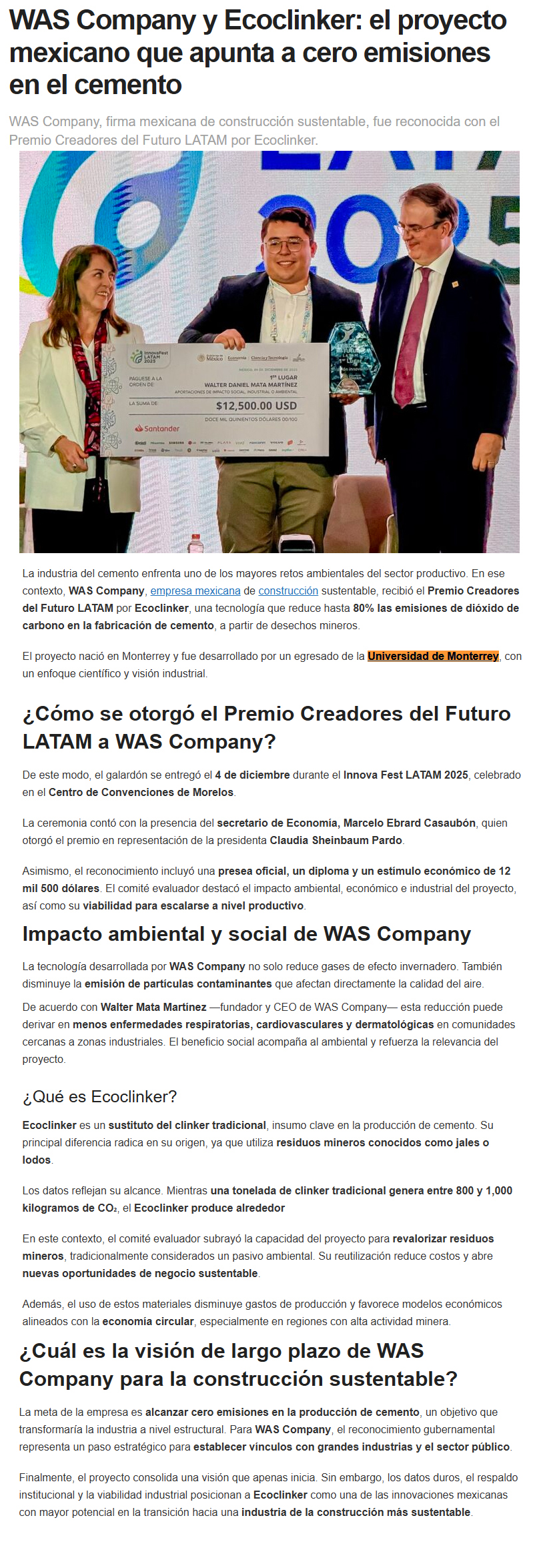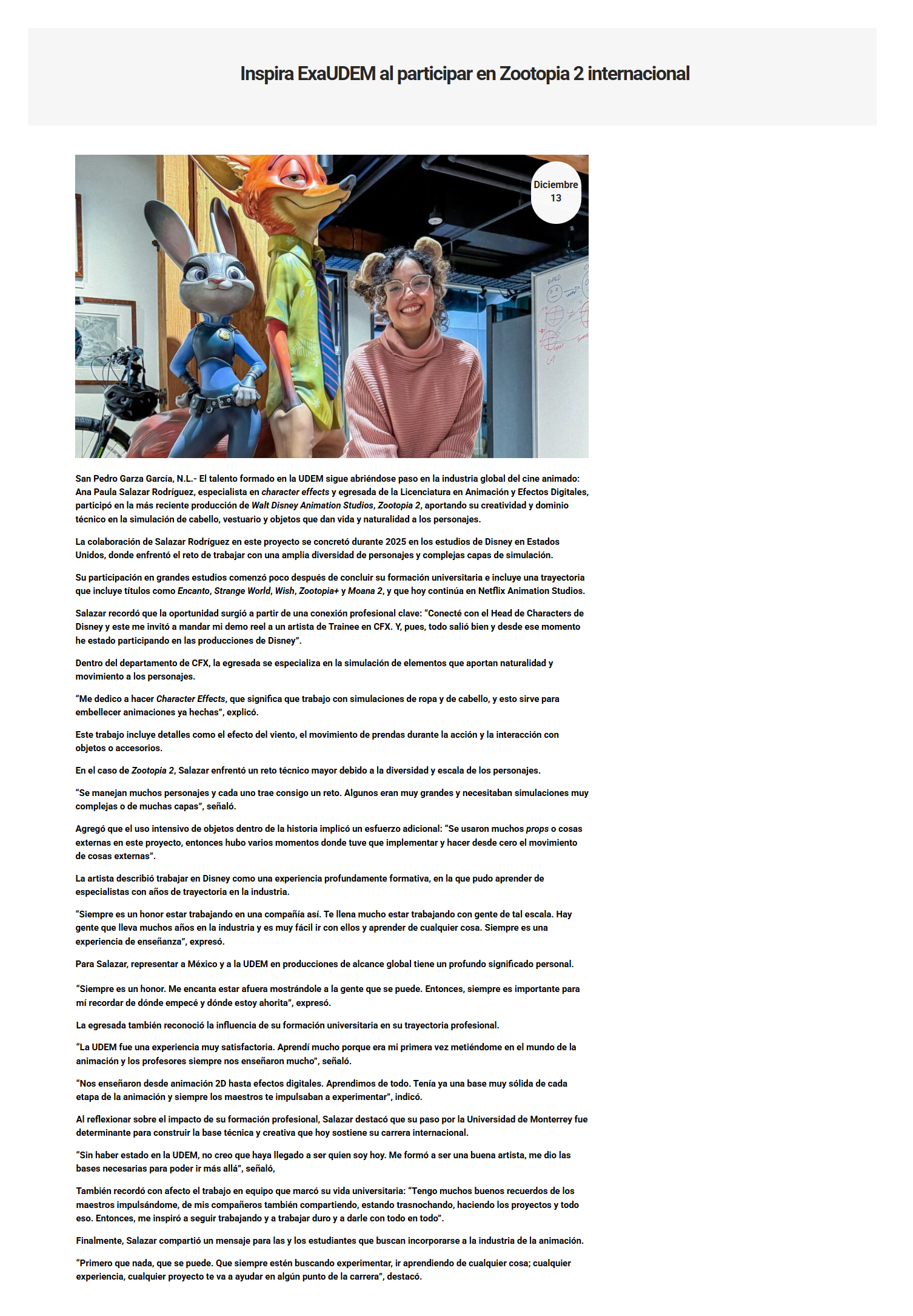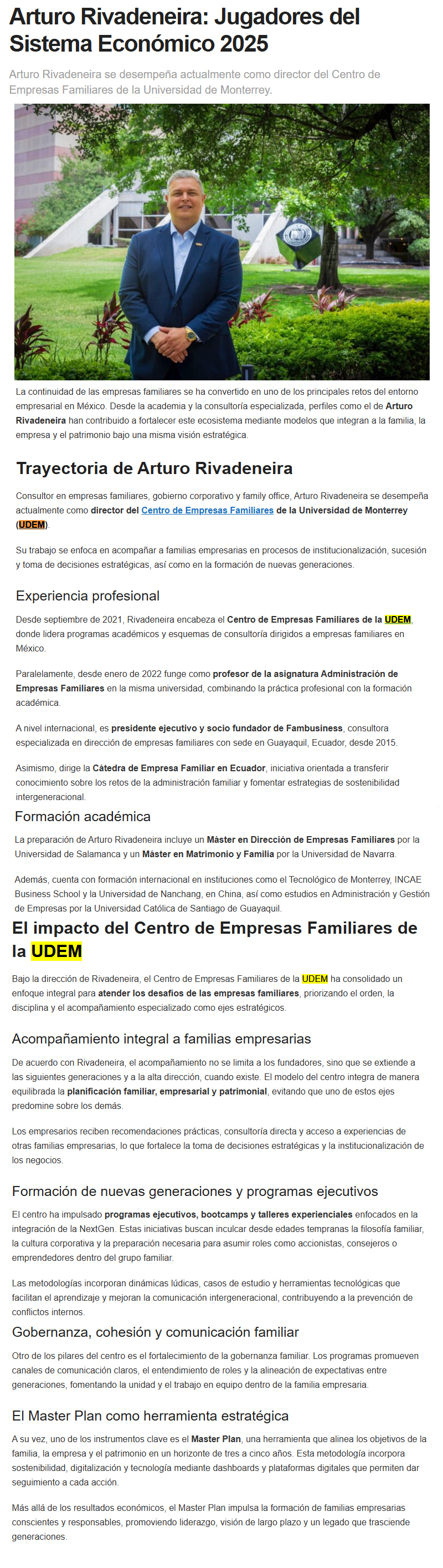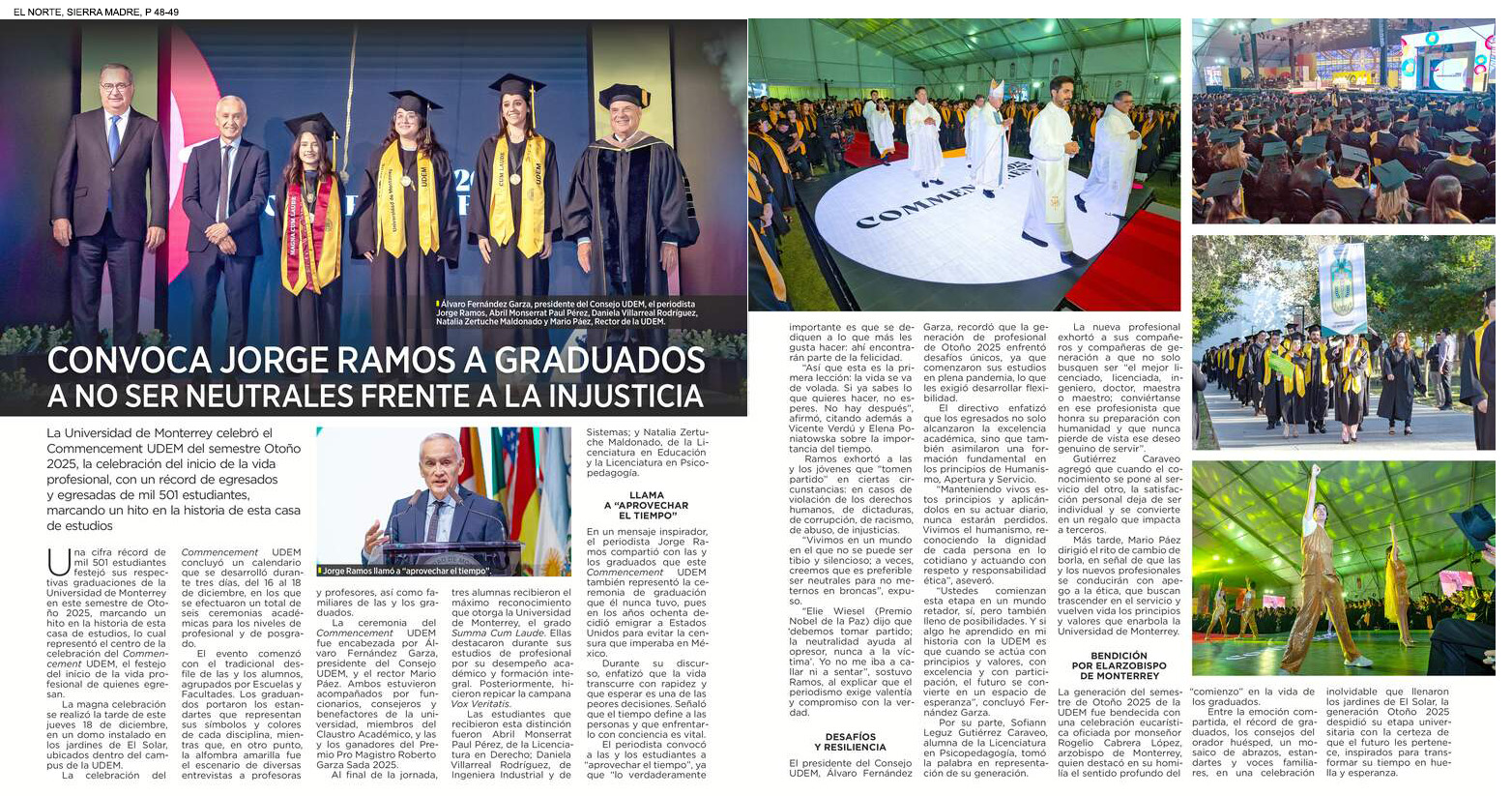 UDEM / Noticias institucionales / UDEM en la prensa Diciembre 2025 Diciembre2025 Arturo Rivadeneira: Jugadores del Sistema Económico 2025 Líder Empresarial30 de diciembre Superan desafíos que lanza la NASA El Norte30 de diciembre 2026 El Norte29 de diciembre Convoca Jorge Ramos a graduados a no ser neutrales frente a la injusticia El Norte26 de diciembre La Universidad de Monterrey celebró el Commencement UDEM del semestre Otoño 2025 Multimedios23 de diciembre Convoca Jorge Ramos a graduados a no ser neutrales ante la injusticia El Norte22 de diciembre Jorge Ramos insta a graduados UDEM a vencer el miedo Milenio22 de diciembre Convierten sargazo en biotextil Multimedios TV22 de diciembre Celebra Commencement Otoño 2025 Televisa 22 de diciembre Oportunismo político El Norte22 de diciembre Del mar a talleres universitarios: cómo darle nueva vida al sargazo Milenio20 de diciembre Alumnas de la UDEM dan nueva vida al sargazo Milenio20 de diciembre Pide no callar ante injusticias El Norte19 de diciembre Destacan futuros egresados vocación humanista y compromiso social El Norte16 de diciembre WAS Company y ecoclinker el proyecto mexicano que apunta a cero emisiones en el cemento Líder Empresarial16 de diciembre El contexto importa El Norte15 de diciembre Inspira ExaUDEM al participar en Zootopia 2 internacional NL Noticias14 de diciembre Obtiene UDEM patente para diagnóstico ágil de cáncer de mama y ovario El Norte11 de diciembre Proponen en tesis crear Universidad Harold Pape La prensa de Coahuila9 de diciembre Arquitectura con propósito UDEM forma líderes que diseñan espacios más habitables y sostenibles Forbes9 de diciembre La Fórmula 1 de los drones autónomos: tres regios retan la era de la IA en Abu Dabi Milenio8 de diciembre Unidad y visibilidad El Norte8 de diciembre Innovan en diseño gráfico que impulsa turismo en Santiago El Porvenir6 de diciembre Arquitectura en comunidad: el papel de las universidades como foro creativo Ad Magazine2 de diciembre Quiere llevar al cine su recuperación El Norte2 de diciembre A contrarreloj El Norte1 de diciembre Arturo Rivadeneira institucionalizar empresas familiares exige orden disciplina y planes de sucesión Líder Empresarial1 de diciembre