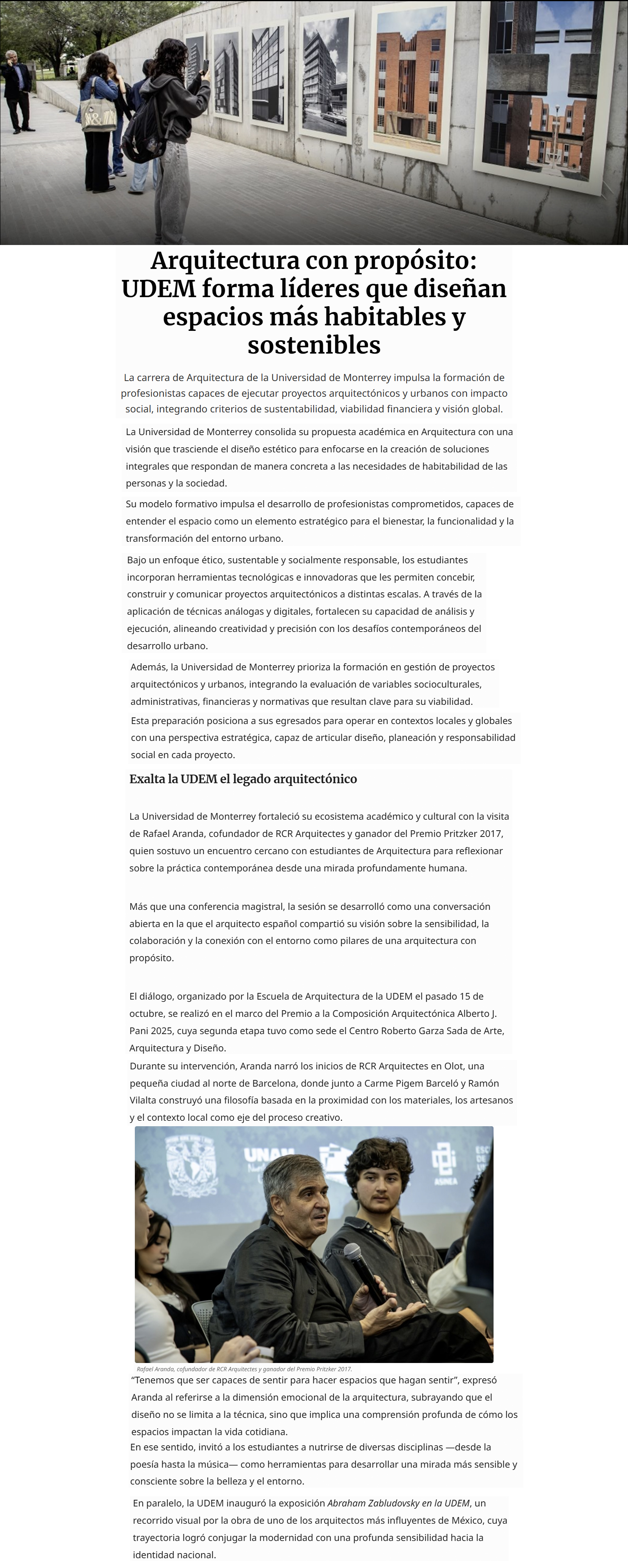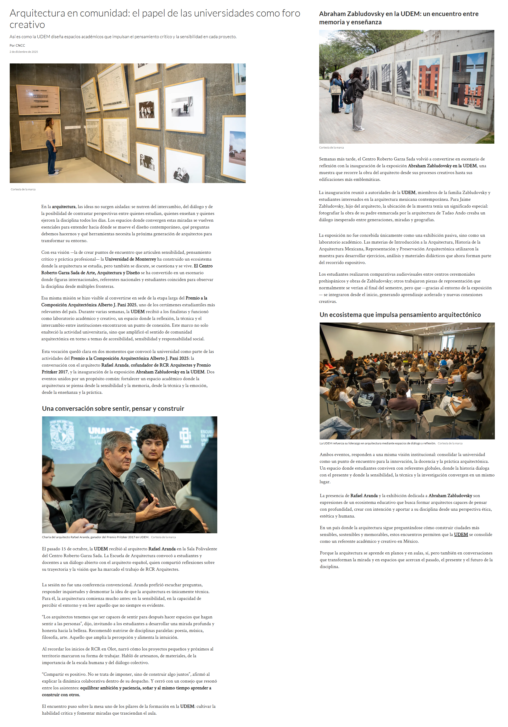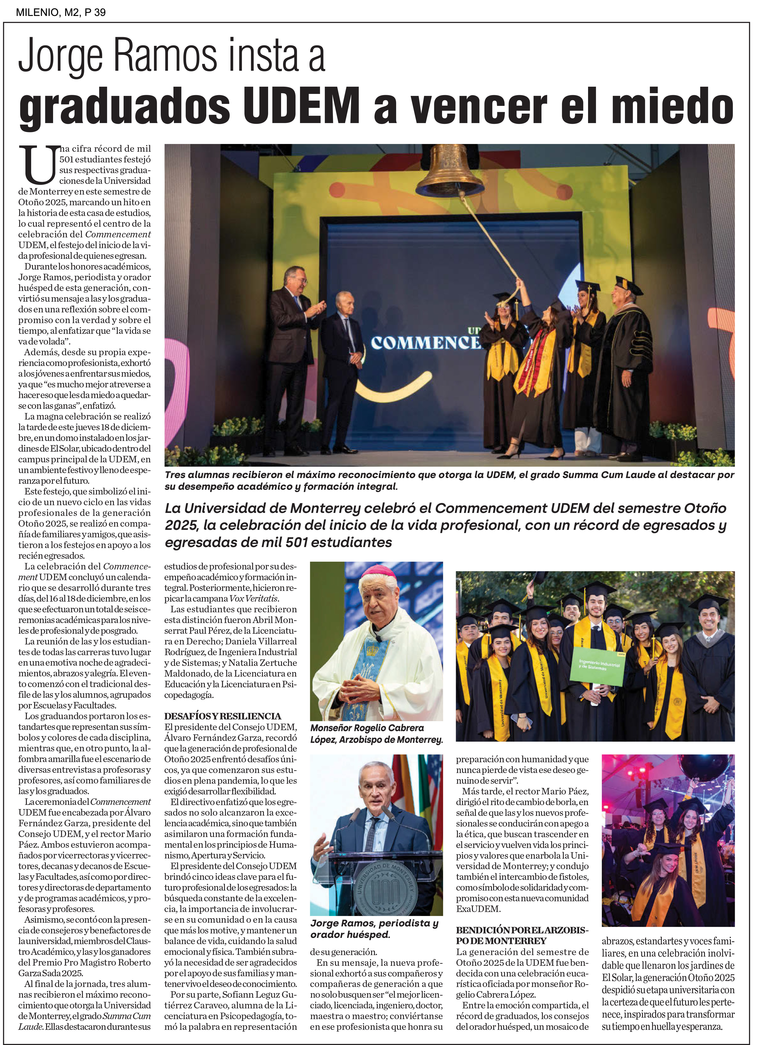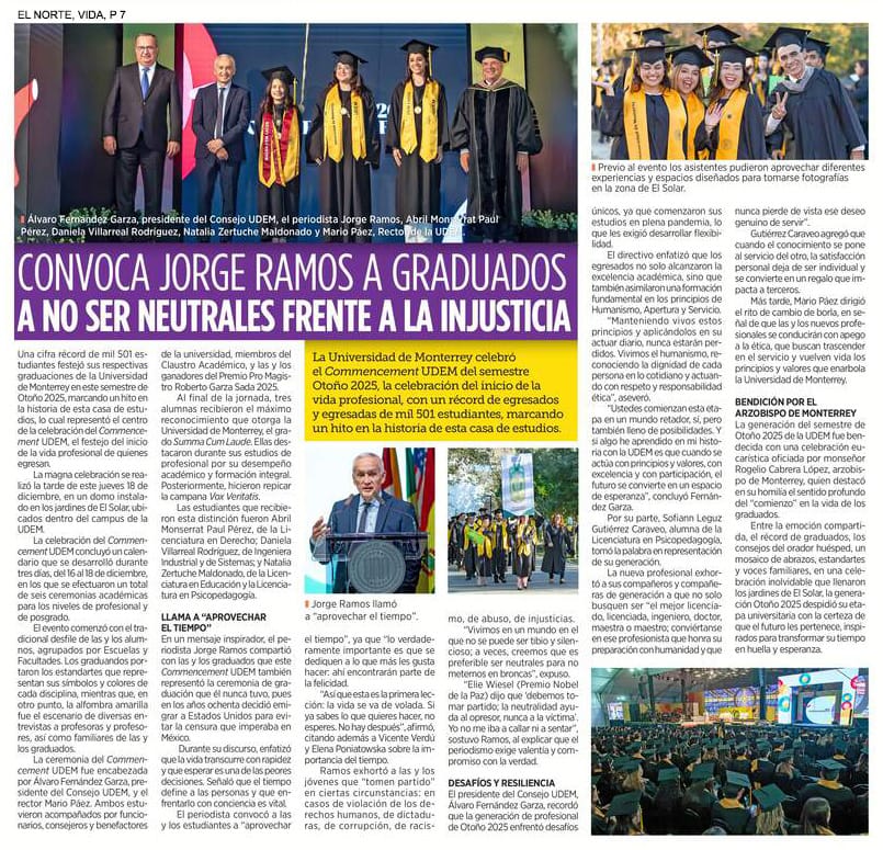 UDEM / Noticias institucionales / UDEM en la prensa Diciembre 2025 Diciembre2025 Convoca Jorge Ramos a graduados a no ser neutrales ante la injusticia El Norte22 de diciembre Jorge Ramos insta a graduados UDEM a vencer el miedo El Norte22 de diciembre Pide no callar ante injusticias El Norte19 de diciembre Destacan futuros egresados vocación humanista y compromiso social El Norte16 de diciembre Obtiene UDEM patente para diagnóstico ágil de cáncer de mama y ovario El Norte11 de diciembre Proponen en tesis crear Universidad Harold Pape La prensa de Coahuila9 de diciembre Arquitectura con propósito UDEM forma líderes que diseñan espacios más habitables y sostenibles Forbes9 de diciembre La Fórmula 1 de los drones autónomos: tres regios retan la era de la IA en Abu Dabi Milenio8 de diciembre Unidad y visibilidad El Norte8 de diciembre Innovan en diseño gráfico que impulsa turismo en Santiago El Porvenir6 de diciembre Arquitectura en comunidad: el papel de las universidades como foro creativo Ad Magazine2 de diciembre Quiere llevar al cine su recuperación El Norte2 de diciembre A contrarreloj El Norte1 de diciembre Arturo Rivadeneira institucionalizar empresas familiares exige orden disciplina y planes de sucesión Líder Empresarial1 de diciembre