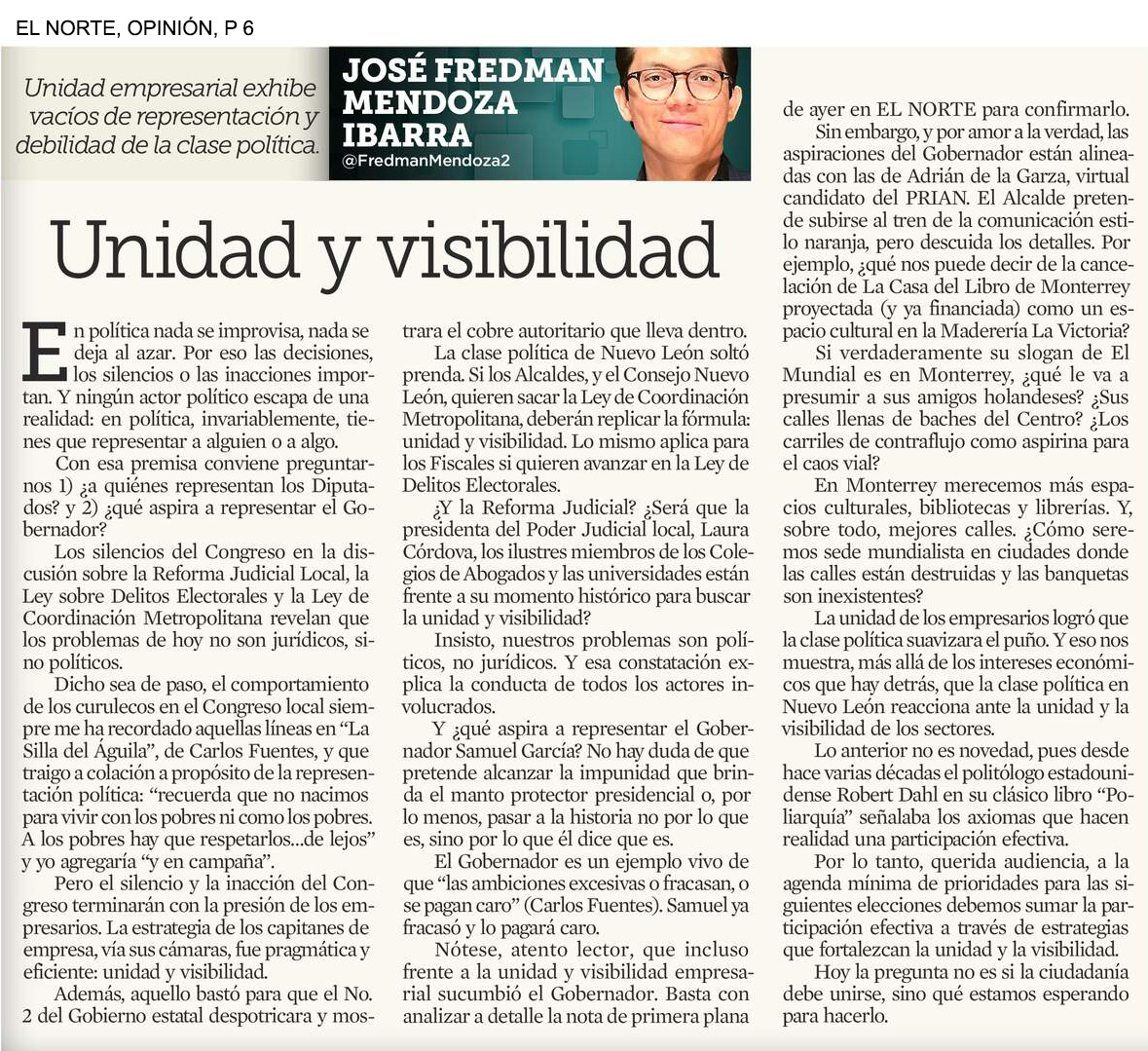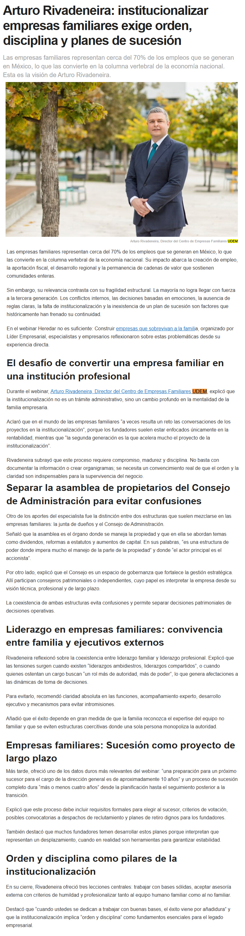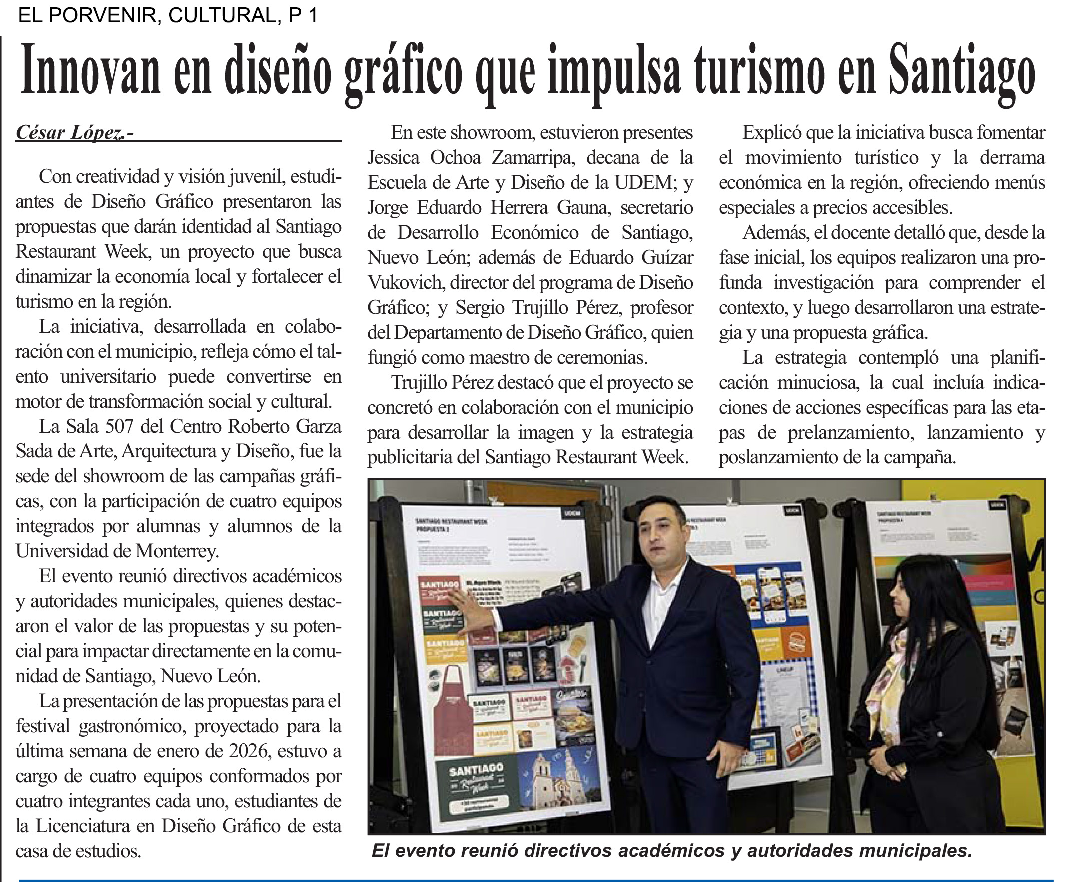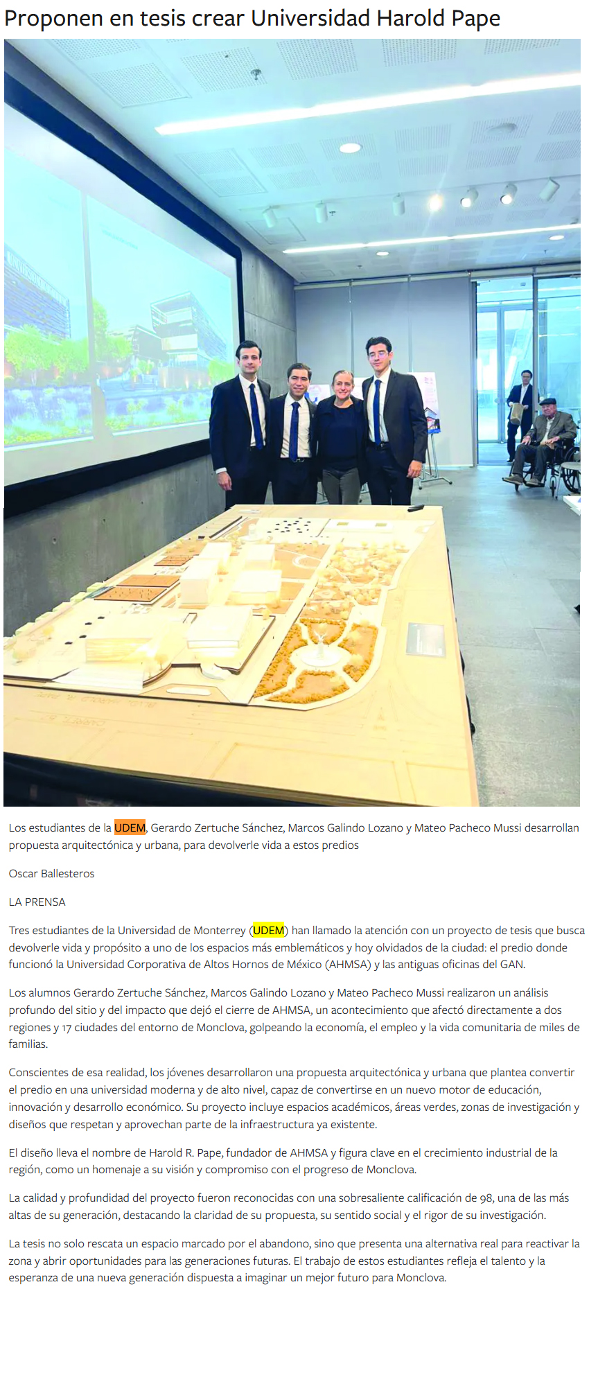 UDEM / Noticias institucionales / UDEM en la prensa Diciembre 2025 Diciembre2025 Convoca Jorge Ramos a graduados a no ser neutrales ante la injusticia El Norte22 de diciembre Jorge Ramos insta a graduados UDEM a vencer el miedo El Norte22 de diciembre Pide no callar ante injusticias El Norte19 de diciembre Destacan futuros egresados vocación humanista y compromiso social El Norte16 de diciembre Obtiene UDEM patente para diagnóstico ágil de cáncer de mama y ovario El Norte11 de diciembre Proponen en tesis crear Universidad Harold Pape La prensa de Coahuila9 de diciembre Arquitectura con propósito UDEM forma líderes que diseñan espacios más habitables y sostenibles Forbes9 de diciembre La Fórmula 1 de los drones autónomos: tres regios retan la era de la IA en Abu Dabi Milenio8 de diciembre Unidad y visibilidad El Norte8 de diciembre Innovan en diseño gráfico que impulsa turismo en Santiago El Porvenir6 de diciembre Arquitectura en comunidad: el papel de las universidades como foro creativo Ad Magazine2 de diciembre Quiere llevar al cine su recuperación El Norte2 de diciembre A contrarreloj El Norte1 de diciembre Arturo Rivadeneira institucionalizar empresas familiares exige orden disciplina y planes de sucesión Líder Empresarial1 de diciembre