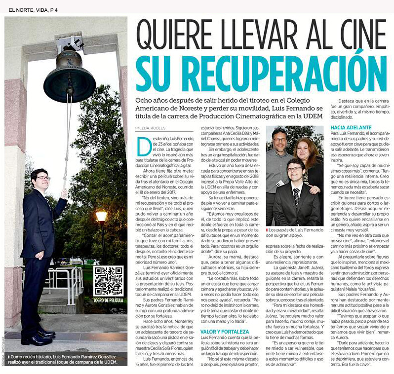 UDEM / Noticias institucionales / UDEM en la prensa Noviembre 2025 Diciembre2025 Quiere llevar al cine su recuperación El Norte2 de diciembre
