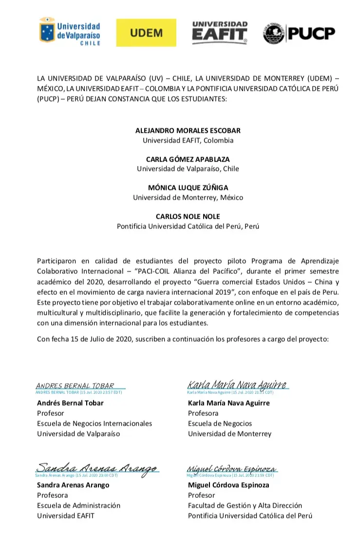 Este año, La profesora Karla Nava del programa de Lic. en Negocios Globales, diseñó junto con colegas de otras universidades socias de la UDEM, el proyecto COIL titulado: "Impactos económicos del Covid-19 en sectores industriales estratégicos de la Región Alianza del Pacífico", en el que participan profesores y alumnos de México (UDEM), Colombia (EAFIT), Perú (PUCP) y Chile (UV), siendo la primera vez en la Escuela de Negocios que se diseña un proyecto COIL con 4 países participando al mismo tiempo desde casa.